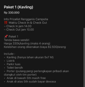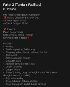 Djamuju menyediakan 2 (dua) jenis paket camping yakni kavling only dan kavling beserta set tenda, yang dapat dilihat pada tabel biaya di bawah ini: